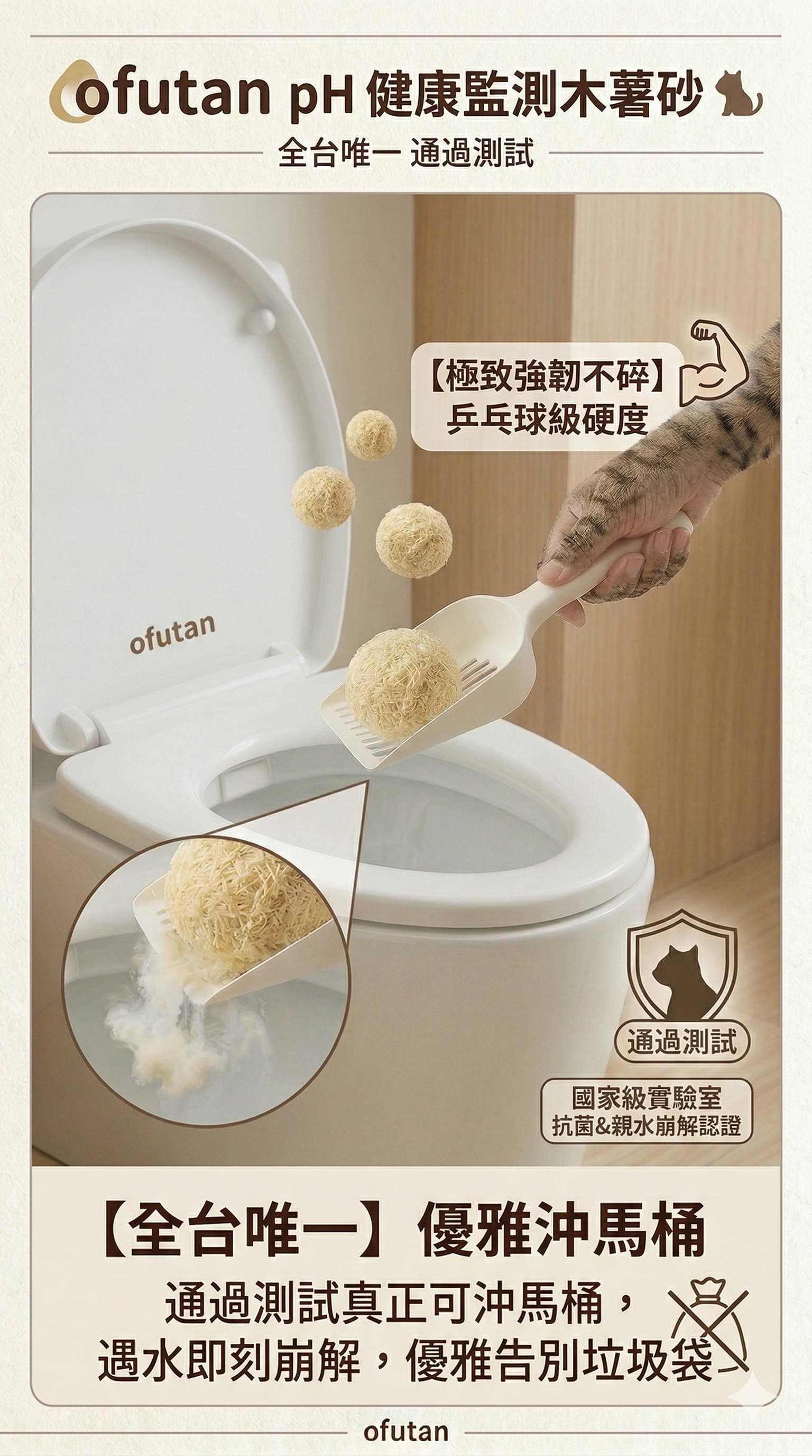 【極致強韌不碎】 乒乓球級硬度砂團,無懼多貓挖掘踩踏,砂盆始終純淨。